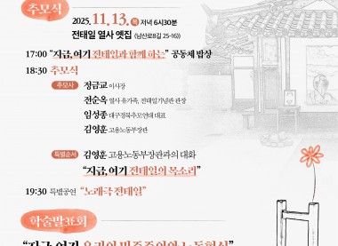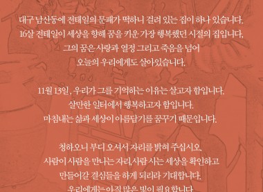 전태일 열사 55주기 추모행사에 초대합니다. 대구 남산동에 전태일의 문패가 떡하니 걸려 있는 집이 하나 있습니다.16살 전태일이 세상을 향해 꿈을 키운 가장 행복했던 시절…